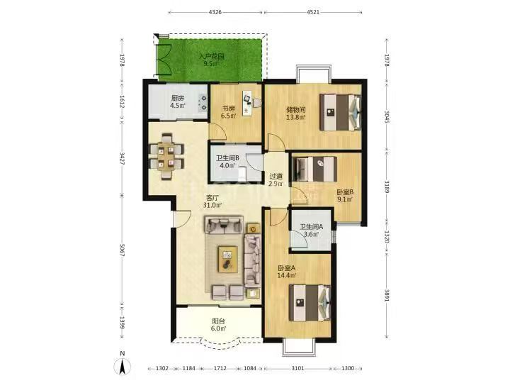 爱联四房两厅三个阳台2700/月,160平原户型.